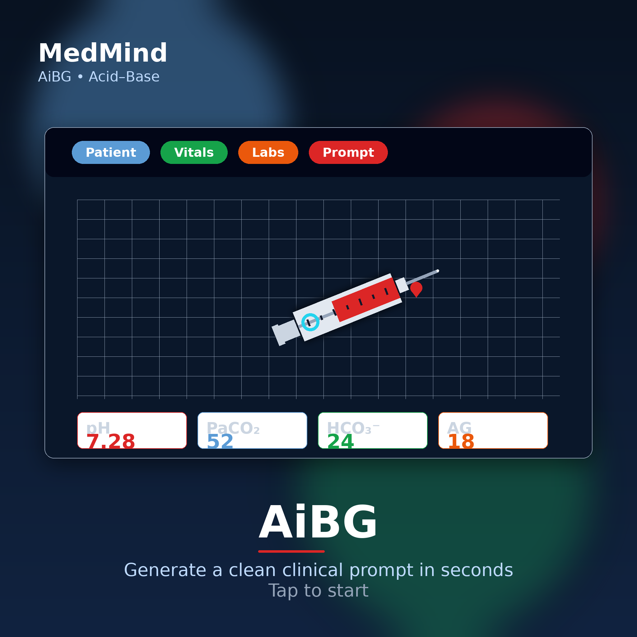 A𝒾BG is a tabbed, clinician-focused prompt generator for ABG/VBG interpretation and acid–base analysis. Users choose a unit system(US/SI), select an interpretation framework (physiologic, base-excess/Copenhagen, or Stewart), and—when permitted—tailor reference ranges. They then enter patient context/demographics, vital signs (including NEWS2), and blood-gas/chemistry data. The interface computes key derived indices (anion gap variants, osmolality gaps, A–a gradient, SID/SIG) and outputs a copy-ready prompt for an LLM, alongside save/reset tools and a brief “moments in history” timeline. An intervention log enables structured documentation of major clinical actions.