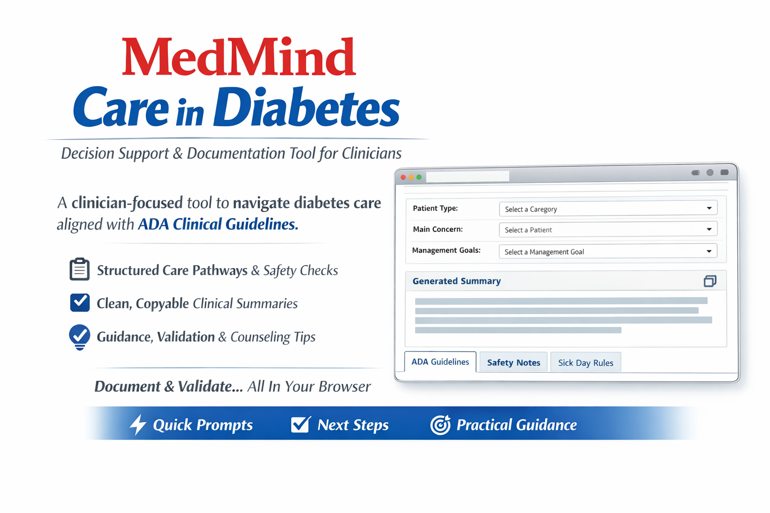 MedM𝒾nd Care in D𝒾abetes is a clinician-oriented decision-support and documentation tool based on ADA-aligned guidance. It helps you navigate common diabetes scenarios (Type 1, Type 2, GDM), follow structured care pathways, and surface safety checks and sick-day rules. You can enter patient context and select relevant guideline sections to automatically generate a clean, copy-ready clinical prompt/summary for documentation or AI-assisted review. The app also supports quick validation cues, “what to do next” checklists, and practical counseling points. Designed to be lightweight and fast, it runs entirely in the browser with a simple, workflow-first UI.