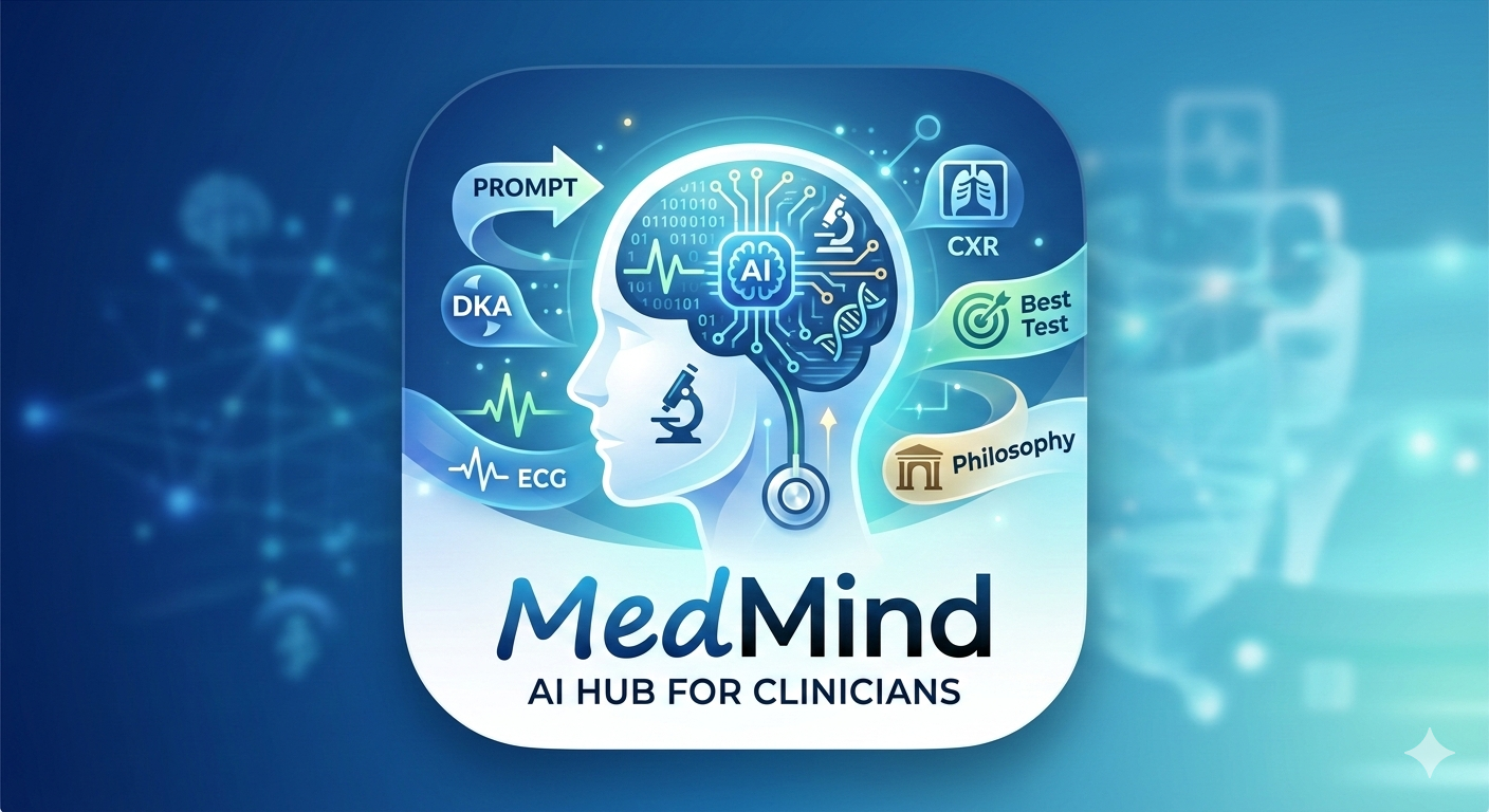 MedMind’s DKA/HHS page is an emergency-department decision-support and prompt generator for diabetic ketoacidosis (DKA), euglycemic DKA (EDKA), and hyperosmolar hyperglycemic state (HHS) in adults and children. It is organized into tabs (Patient Information, Vital Signs, Laboratory Results, Intervention Log) to capture demographics, comorbidities, anthropometrics/BMI, respiratory and cardiovascular parameters, and key investigations. The tool then prepares a structured, evidence-oriented prompt to paste into an LLM (e.g., ChatGPT, Gemini, Claude) for guideline-driven management steps.