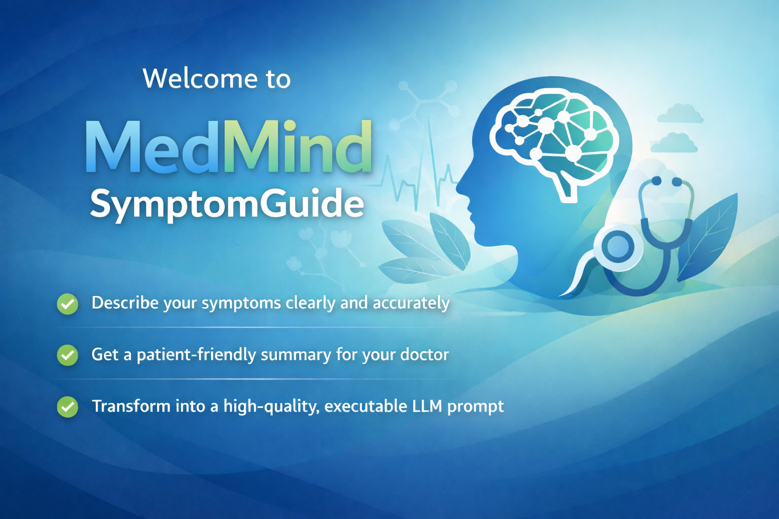 MedM𝒾nd SymptomGu𝒾de helps people describe their symptoms in a simple, clear, and organized way. It turns the information they enter into an easy-to-follow summary, highlights possible warning signs, and provides practical guidance on what to do next. The app also helps users prepare for a doctor’s appointment by organizing key details such as symptoms, medical history, medications, and any available test results. In addition, it can transform this information into a well-structured prompt for use with an AI tool. Its goal is to help people better understand their health information, communicate it more effectively, and feel more prepared before seeking medical advice.