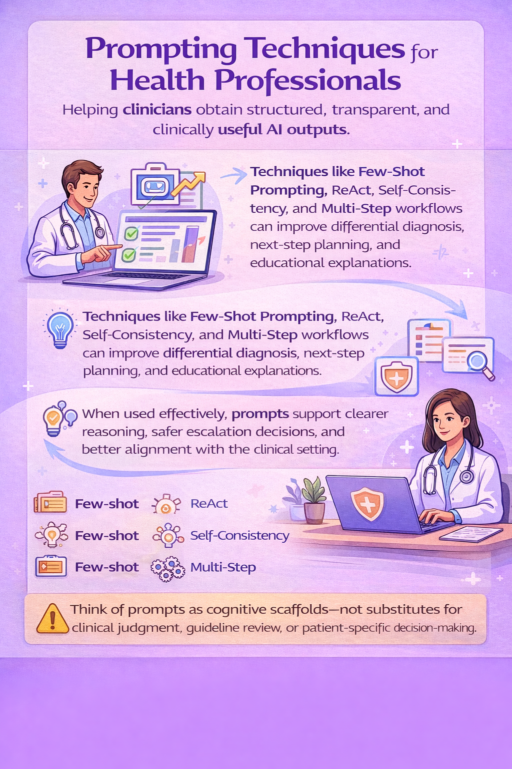Prompting techniques can help health professionals obtain more structured, transparent, and clinically useful AI outputs. Methods such as few-shot prompting, ReAct, self-consistency, and multi-step workflows can improve differential diagnosis generation, next-step planning, and educational explanations. Used well, they support clearer reasoning, safer escalation decisions, and better alignment with the clinical setting. They are best treated as cognitive scaffolds—not substitutes for clinical judgment, guideline review, or patient-specific decision-making.