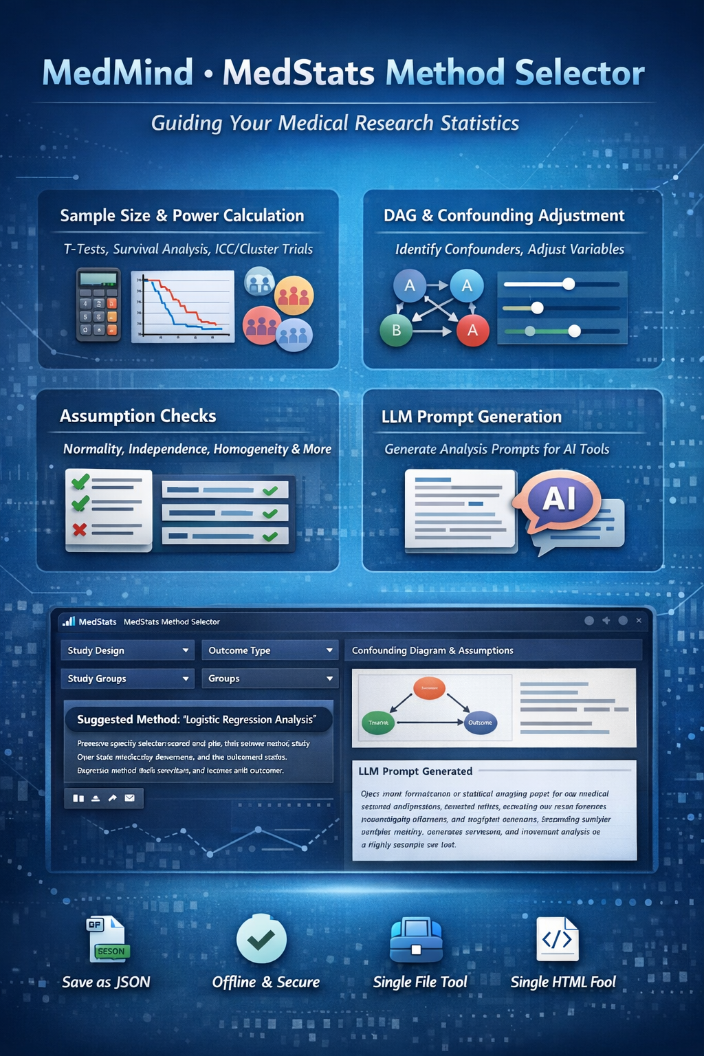 MedMind’s MedStats Method Selector is a web app that helps clinicians choose the right statistical approach for a medical research paper. It guides you through study design, outcome type, grouping, pairing, clustering, and adjustment needs, then recommends primary methods with effect sizes and reporting text.