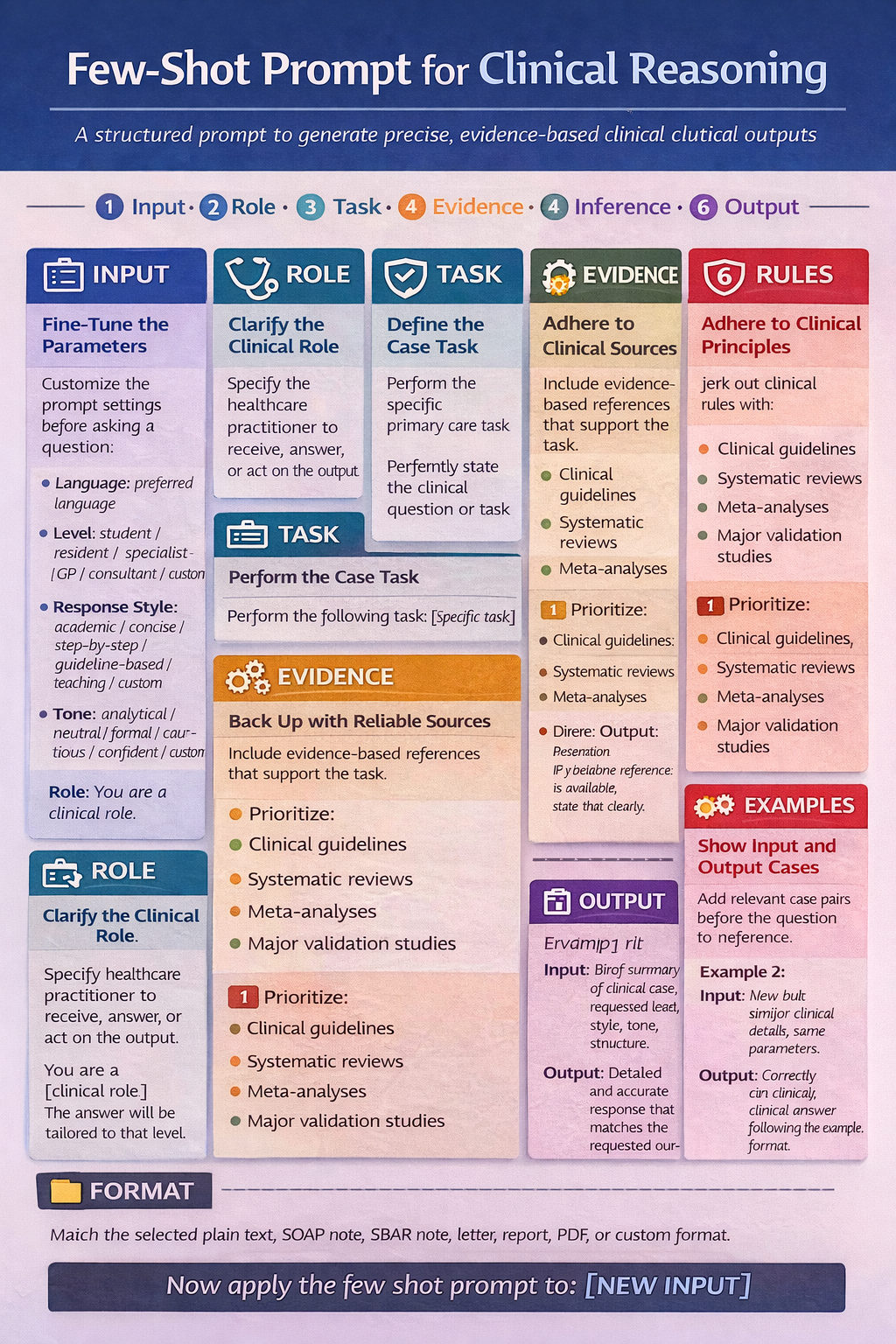 For health-professional use, few-shot prompts work best when the examples are: from the same clinical domain, in the same output format, at the same level of detail, constrained by “do not invent data”