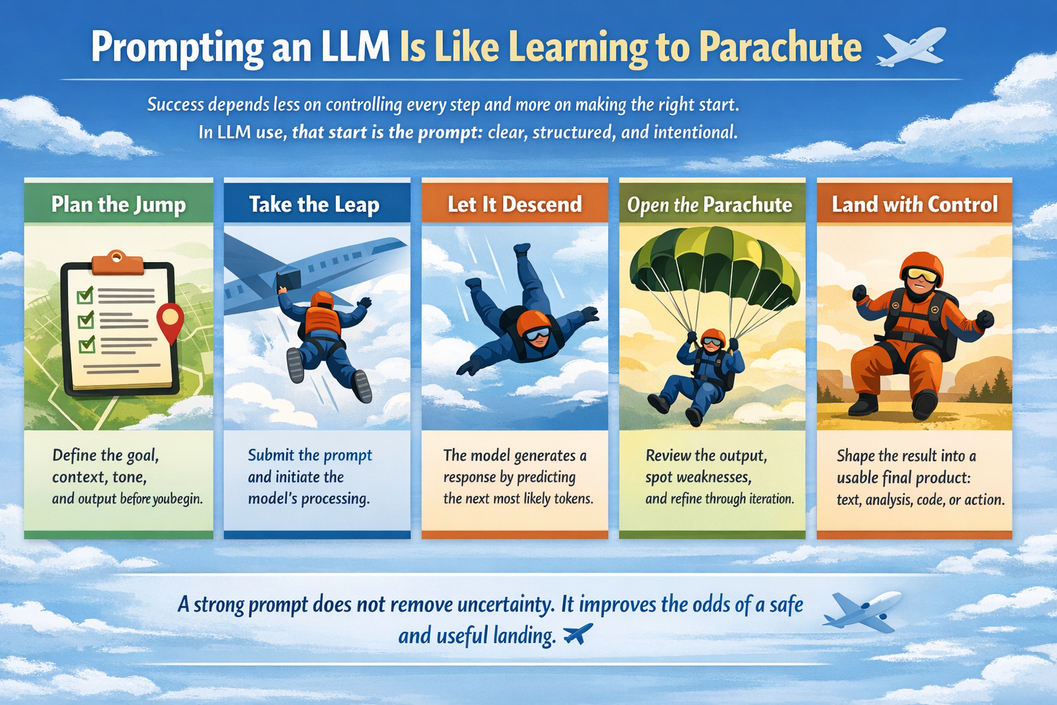 - Using Large Language Models is like training a paratrooper: all you need to master is the art of jumping correctly—from there on, gravity takes over. In the same way, learn to formulate the right prompt, and the language model will take care of everything else.